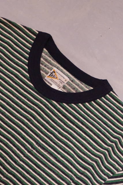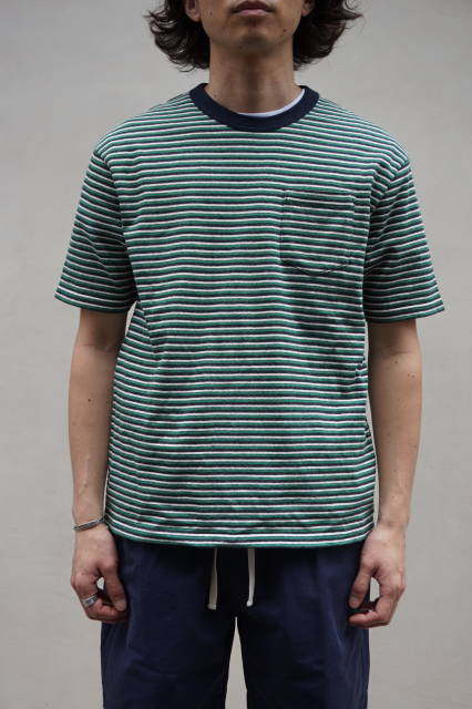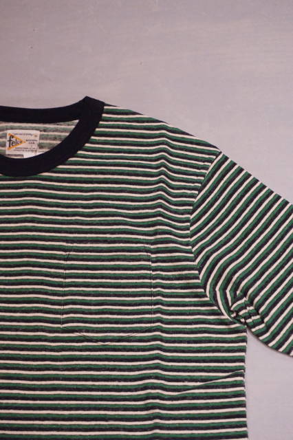 『FELCO』 (フェルコ) 半そで クルーネック ポケット Tシャツ リサイクル マルチストライプ(グリーン系) 日本製