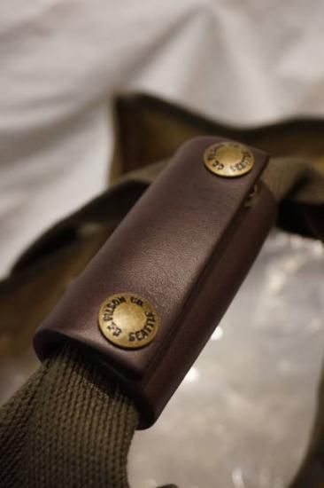 幅広で丈夫なコットンウェビングのハンドルに、ブライドルレザーのスナップ固定式キャリーグリップがつき、